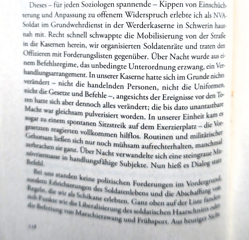 "[S.118: ]Ab einem gewissen Punkt hatten dann viele das Gefühl, es sei tatsächlich möglich, der Führung durch einen stummen Protestzug durch die Innenstadt Zugeständnisse abzuringen. .Dieses – für jeden Soziologen spannende – Kippen von Einschüchterung und Anpassung zu offenen Widerspruch erlebte ich als NVA-Soldat im Grundwehrdienst in der Werder Kaserne in Schwerin hautnah mit. ...